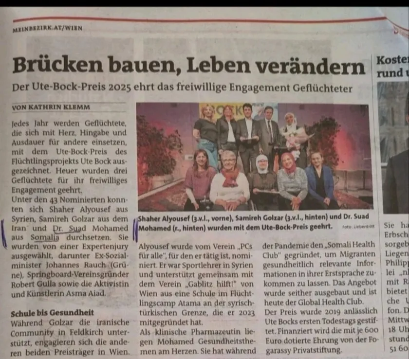 We are thankful that our organization, Global Health Club, has won the Ute-Bock-Preis. This recognition strengthens our commitment and motivates us to continue the important work we do.